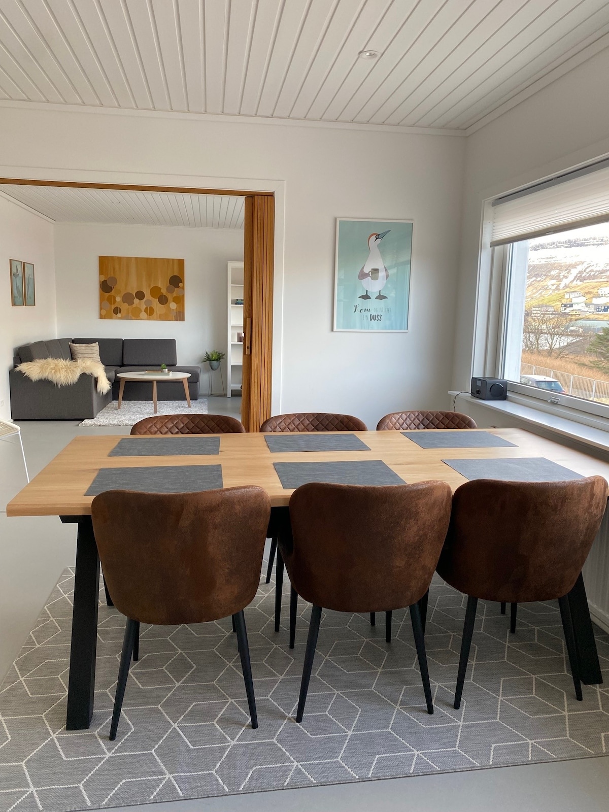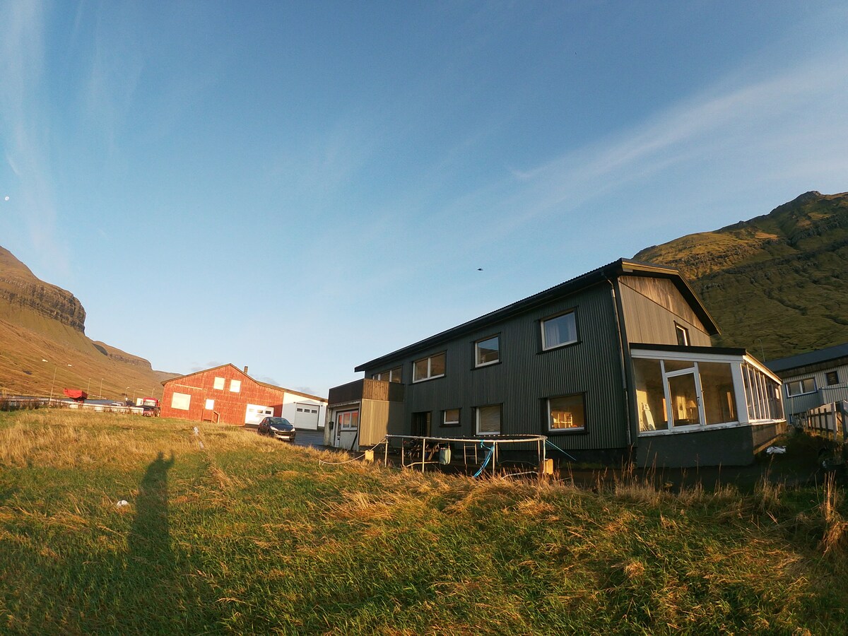 Švarus ir jaukus butas, puikiai tinka porai, bet su galimybe išnuomoti du kitus kambarius iš viso 5 asmenims, jei reikia. Butas yra viršutiniame namo aukšte, Fuglafjørð centre. Maisto prekių parduotuvės, kavinė/baras, kultūros namai, bankomatas, autobusų stotelė ir paplūdimys yra tiesiog už 2 min. kelio pėsčiomis. Kieme yra nedidelis viešasis parkas su lauko kavine, kuriame žmonės susitinka kavos gražioje aplinkoje. Turistų informacija yra mūsų kaimynas.