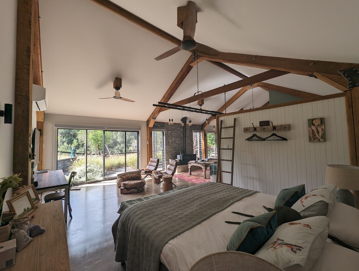 Escape the world! A serene, peaceful, luxurious, private experience for couples in the peaceful and divine haven of the Promised Land, just outside quirky Bellingen. Views over Gondwana Land. Awake to the birdsong. 5 minutes to Never Never river swim holes. Fully airconditioned, serene candle lit outdoor bath, rain shower, fire pit and internal fire place (winter use only), dishwasher, BBQ, HD television, Netflix, Starlink unlimited internet, home made bread. Solitude! Indulge!