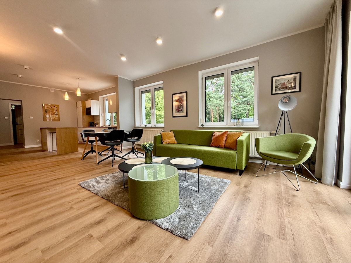 Puiki vieta pačiame Nowy Dwór Mazowiecki centre, Józefa Wybicki parko rajone su vaikų žaidimų aikštele, fontanu, amfiteatru ir lauko sporto sale. Tai gražus rajonas netoli Narew upės, kuriame yra paplūdimys, dėl kurio jų viešnagė buvo malonesnė. Netoliese yra varlių parduotuvė, vaistinė , bažnyčia, restoranas, parduotuvės, autobusų stotelė ir prekybos centras. Iki PKP stoties 5 min . Modlino tvirtovė 5 min., 10 min. nuo Modlino oro uosto ir 40 min. nuo Varšuvos centro.