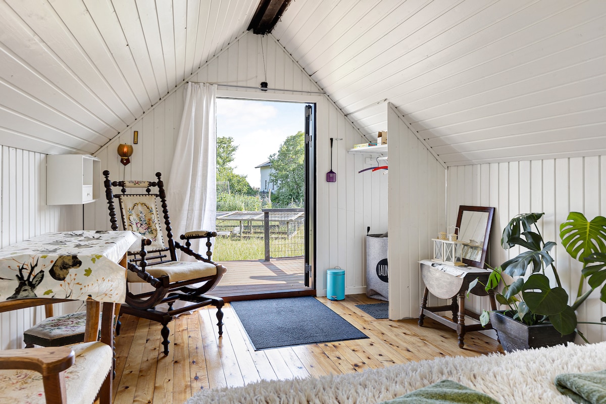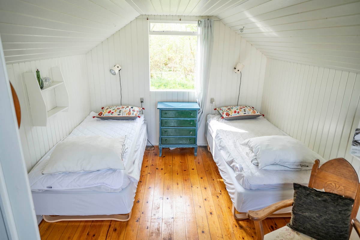Šiame senesniame ir autentiškame kotedže rasite gražų sodą su laužaviete ir dengta terasa šviesiems vakarams. Namuose yra svetainė su malkomis kūrenama virykle ir didelė, patogi sofa su vieta visai šeimai. Namuose yra nauja, graži virtuvė su indaplove. Yra valgomoji zona, kurioje telpa 4-6 žmonės. Be to, yra du kambariai: miegamasis su dvigule lova ir mažas vaikų kambarys su dviaukšte lova. Jei turite didesnių vaikų ar didelės šeimos, jie gali miegoti mūsų puikiame, naujai renovuotame priestate.
