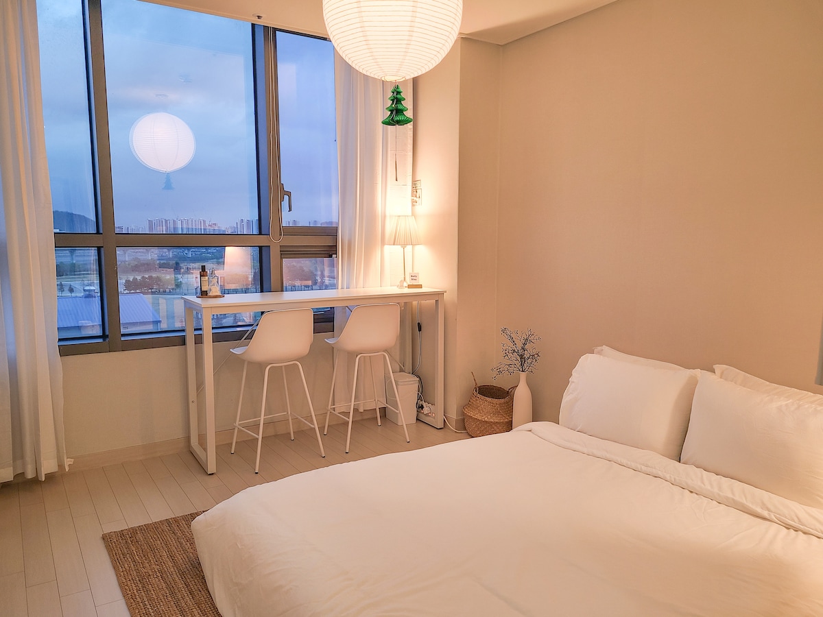 "2024년 3월 29일(금)부터 일회용품 무상제공이 금지됩니다" 퀸배드 1, 슈퍼싱글배드 1,의자 3개, 식기류 3세트 [Couple/Triple] Cozy 2-beds and 3/4 bath (1 Queen bed, 1 Super single bed) The Incheon Bridge view -Connect to Subway stn. "자가 격리가 불가능한 건물입니다." *Government Authorized* - Super Safe Guest house ▣무료(Free): 와이파이, 유튜브,건물내 주차 ▣비누, 네스프레소 캡슐커피머신,생수, 암막커튼,삼푸,린스,바디워시 ▣냉장고,드롬,커피포트,헤어드라이어,선풍기,청소도구 ▣달빛축제공원역 : 도보5분 ▣식당,카페, 편의점등 건물내 입점 ▣냉방&난방 안내 2025년 10월 13일 냉방 종료 / 10월 27일 난방 시작 ▣달빛축제공원에서 산책 ▣수영장개장(6월예정) : 투숙객 할인