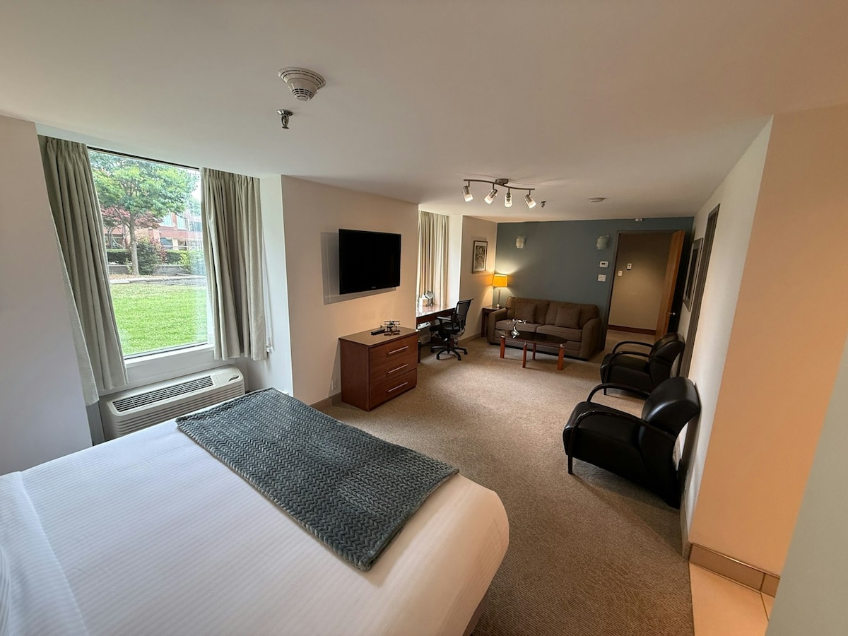Spacious and flexible 1209 sqft , the Pilot Lounge is designed for fun, connection, and comfort. Featuring a private game room, multiple smart TVs, and a convenient kitchenette, this suite is perfect for hosting, relaxing, or gathering with friends and family. Executive King rooms feature 2 BR , 1 King & 1 Queen bed with pillow-top mattresses and duvet. Amenities include large cable tv, HSIA, refrigerator, iron & ironing board. Private bath stocked with toiletries, plush towels and hair dryer.