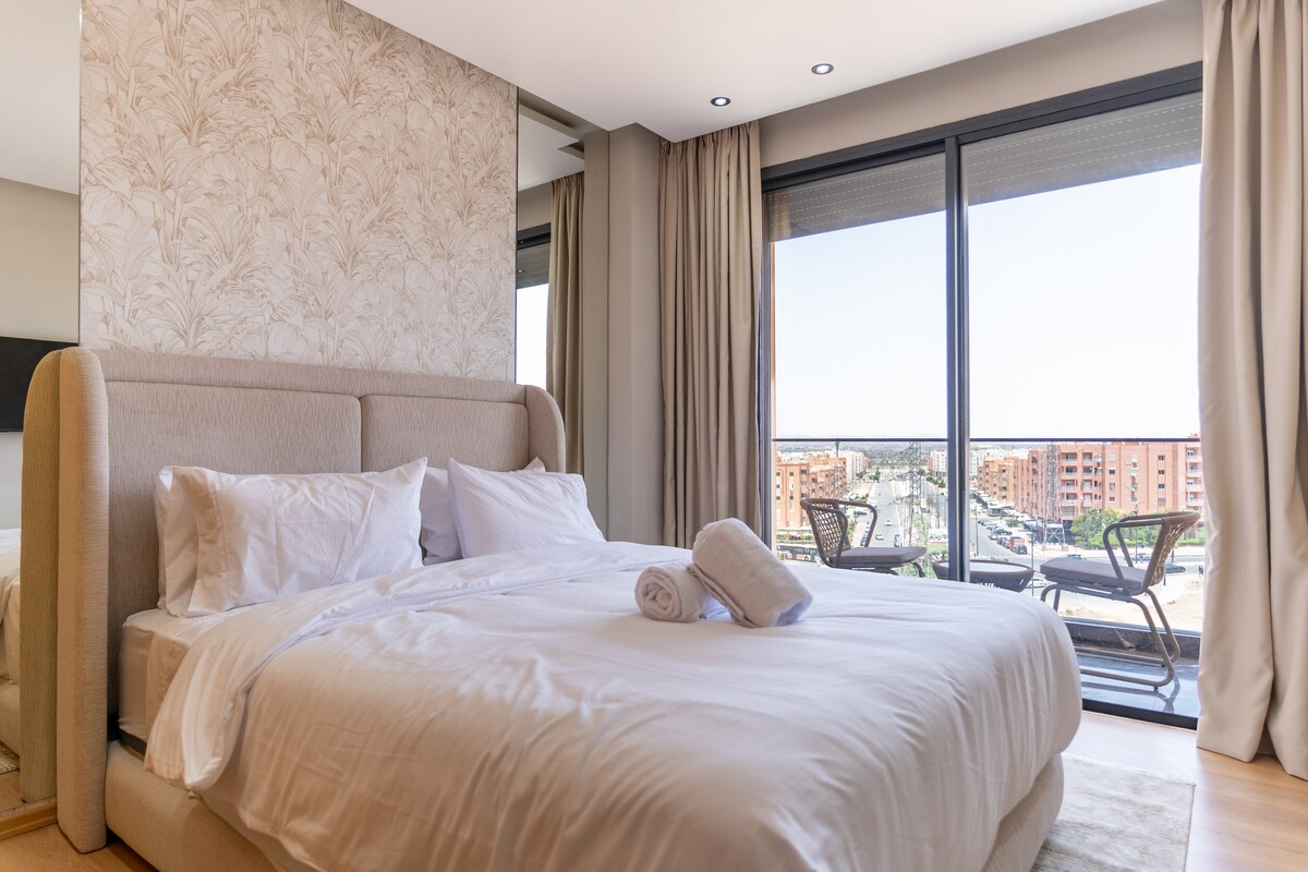 Moderni ir jauki studija su balkonu – Marakečas ✨ Sveikiname atvykus į šią elegantišką 45 m² studiją, idealiai įsikūrusią, puikiai tinkančią turistams ar verslo keliautojams. Butas yra trečiame aukšte ir siūlo šviesią, modernią ir kruopščiai įrengtą erdvę. Dekoras derina šiltus tonus ir šiuolaikinius baldus, kad atmosfera būtų ir prašmatni, ir jauki.
