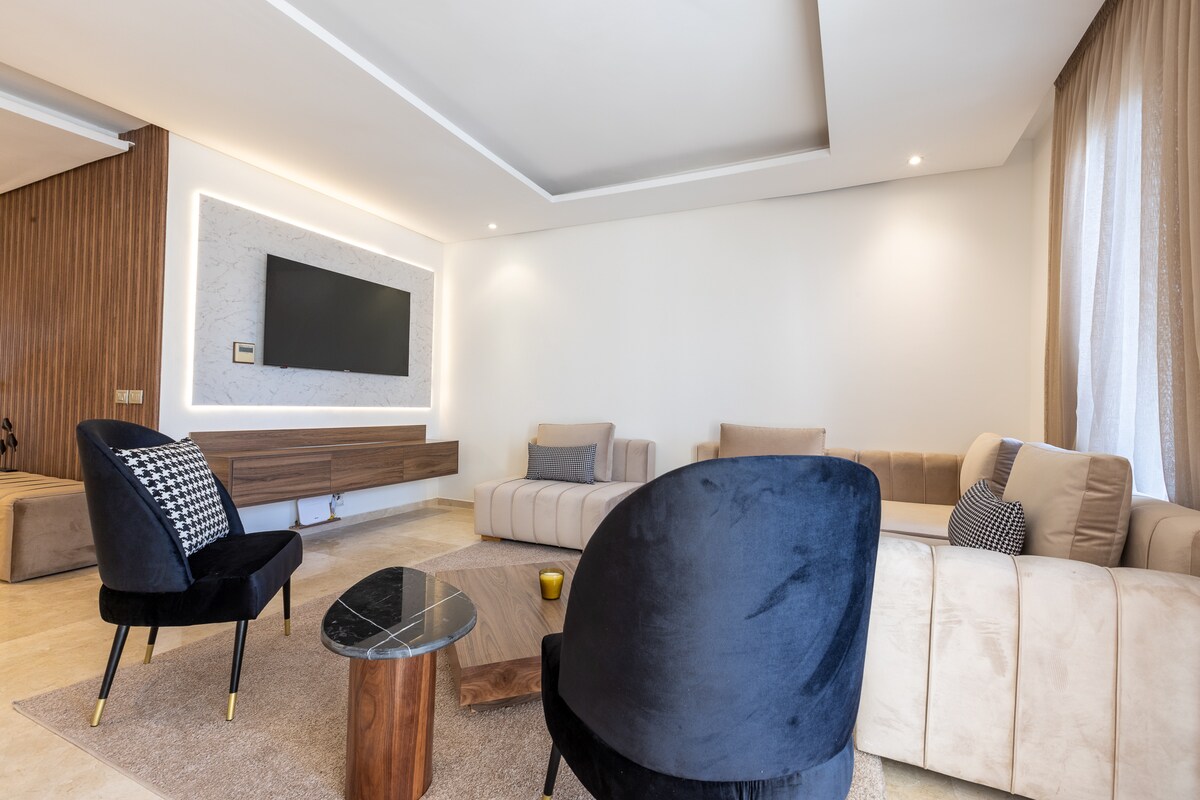 Sveiki atvykę į mūsų stulbinantį 3BR butą, esantį Hay Riad širdyje, Rabate! Šis prabangus ir erdvus būstas pasižymi komfortu ir stiliumi, kuriame yra dvi svetainės, valgomasis, židinys, trys vonios kambariai, trys miegamieji ir pilnai įrengta virtuvė. Bute yra trys erdvūs ir gražiai dekoruoti miegamieji. Mūsų 3BR butas Hay Riad yra puikus pasirinkimas šeimoms, poroms ir draugų grupėms, ieškančioms prabangios ir patogios viešnagės Rabate.