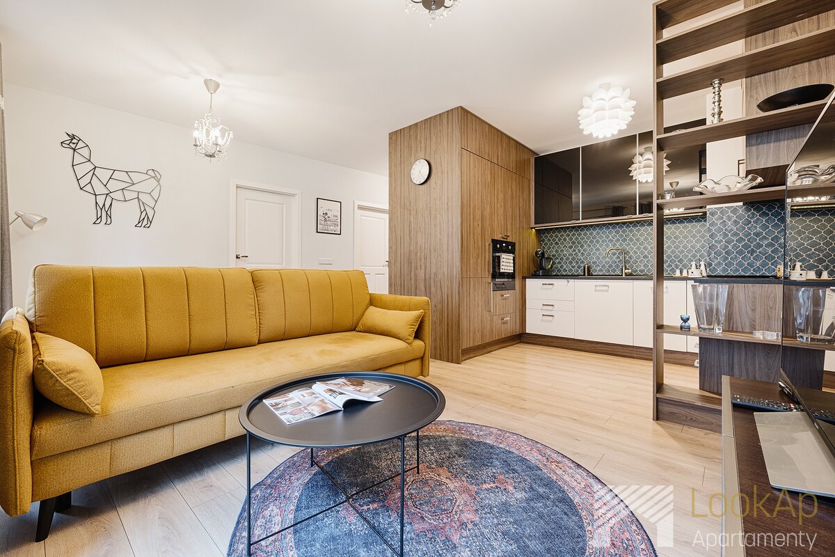 Modernus ir pilnai įrengtas 1 miegamojo butas šeštame aukšte priešais Manufakturą. Didelis balkonas su įspūdingu vaizdu į miestą. Oro kondicionierius. Požeminė privati automobilių stovėjimo aikštelė, pastate yra liftas. Butas idealiai tinka tiek savaitgalio išvykoms, tiek verslo kelionėms. Puiki vieta - galėsite nuvykti pėsčiomis arba viešuoju transportu į svarbiausias Lodzės lankytinas vietas.