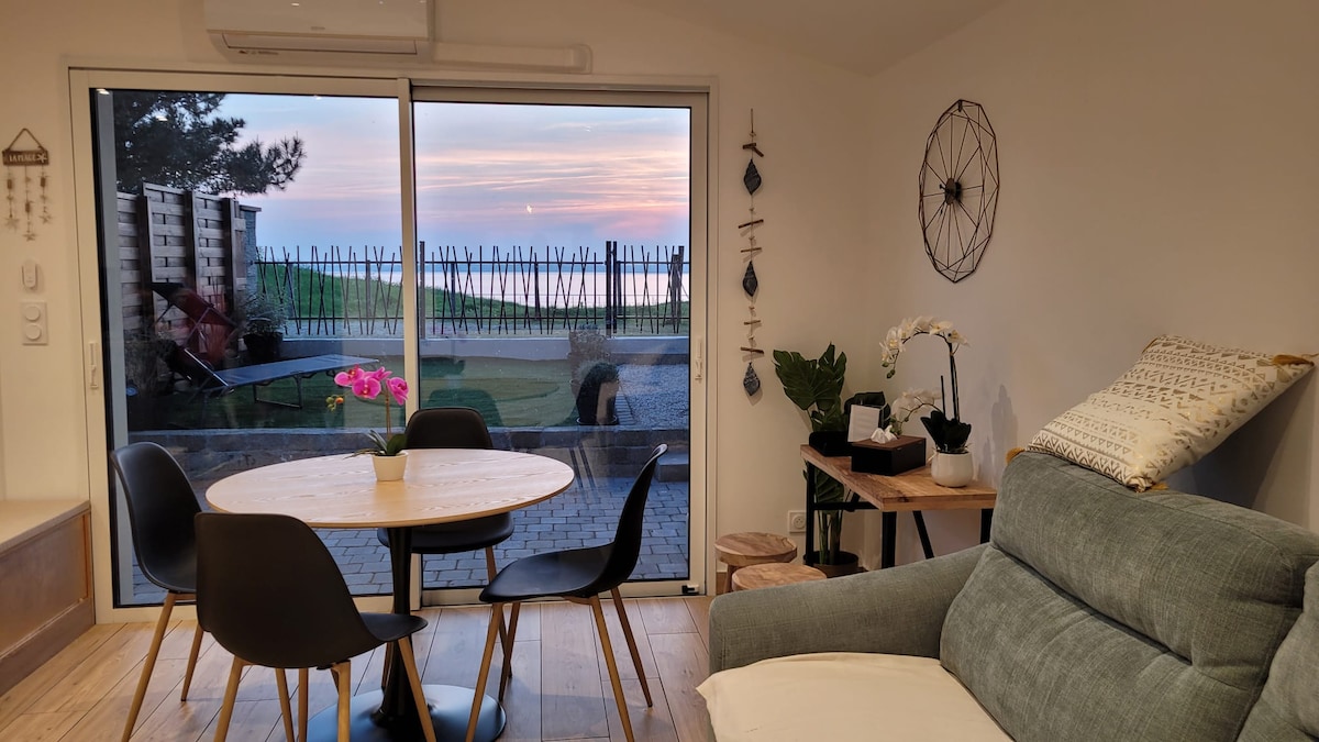 Mėgaukitės unikalia viešnage priešais vandenyną, be automobilio priešais pastatą. Pasivaikščiojimas arba važiavimas dviračiu pakrantės taku, parduotuvės, į kurias galima nueiti pėsčiomis, ir privatus uždaras garažas, kad galėtumėte keliauti ramiai. Viduje: įspūdingas vaizdas į jūrą, pilnai įrengta aukštos klasės virtuvė, patogi patalynė ir netipiškas išplanavimas su dušu, integruotu į miegamąjį. 👉 Retas būstas, kuriame dera absoliuti ramybė, aukščiausios kokybės komfortas ir originalumas nepamirštamam poilsiui.
