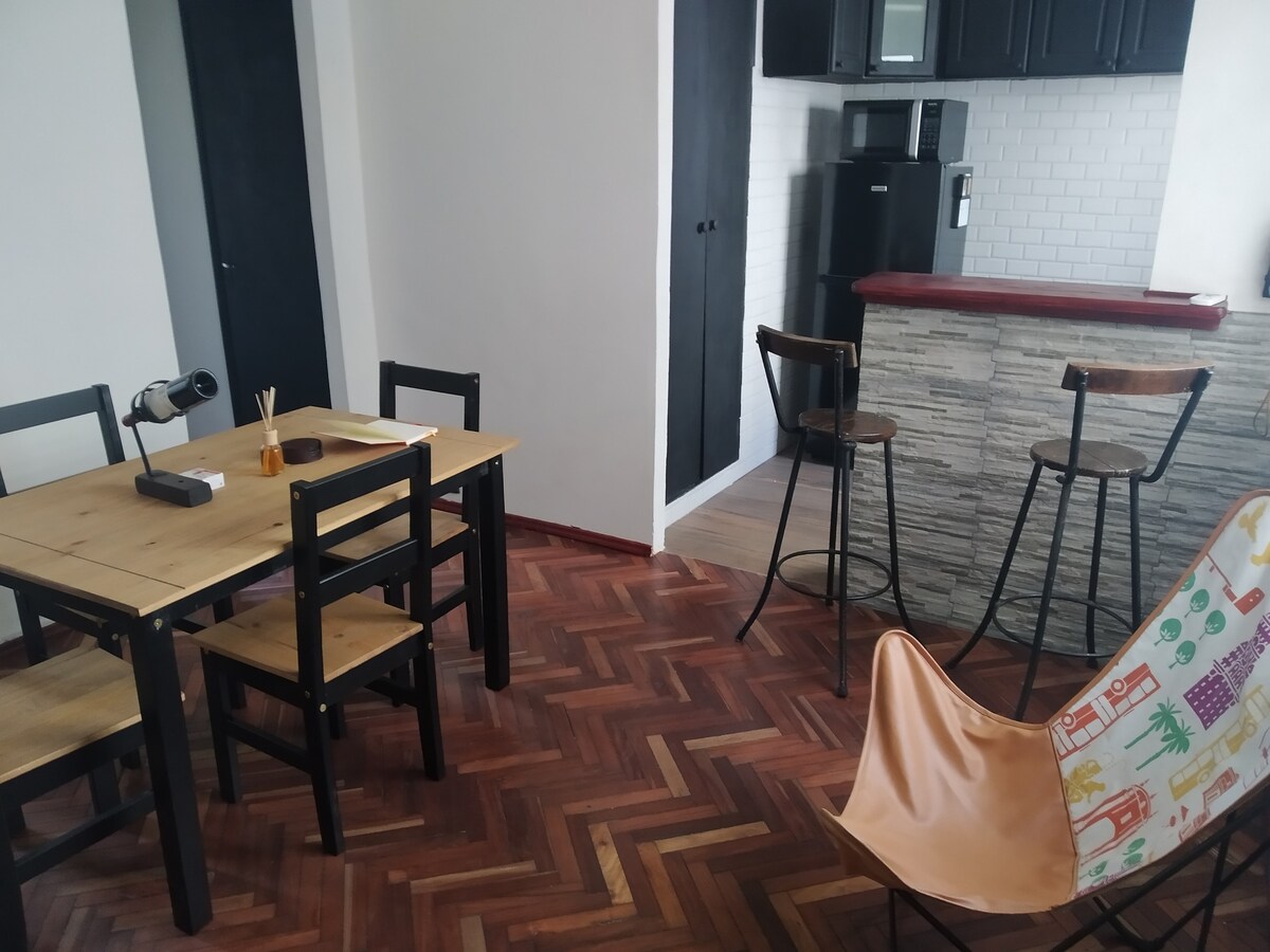 Visiškai naujas centrinis butas iki 3 žmonių priešais Plaza Entrevero. Labai šviesi viengulė aplinka su integruota virtuve, viena kvadratine lova (sulankstoma), dvigule sofa-lova. Pilnai įrengta 3 žmonėms: patalynė (įskaitant paltą), pilnas rankšluosčių rinkinys, indai. 40pėdų išmanioji televizija, „Netflix“. WI-FI. Oro kondicionierius Naujas pastatas, vartai ir liftai. Ideali vieta, visas Montevideo centras, pusė kvartalo nuo pagrindinės aveniu (paslaugos ir transportas)