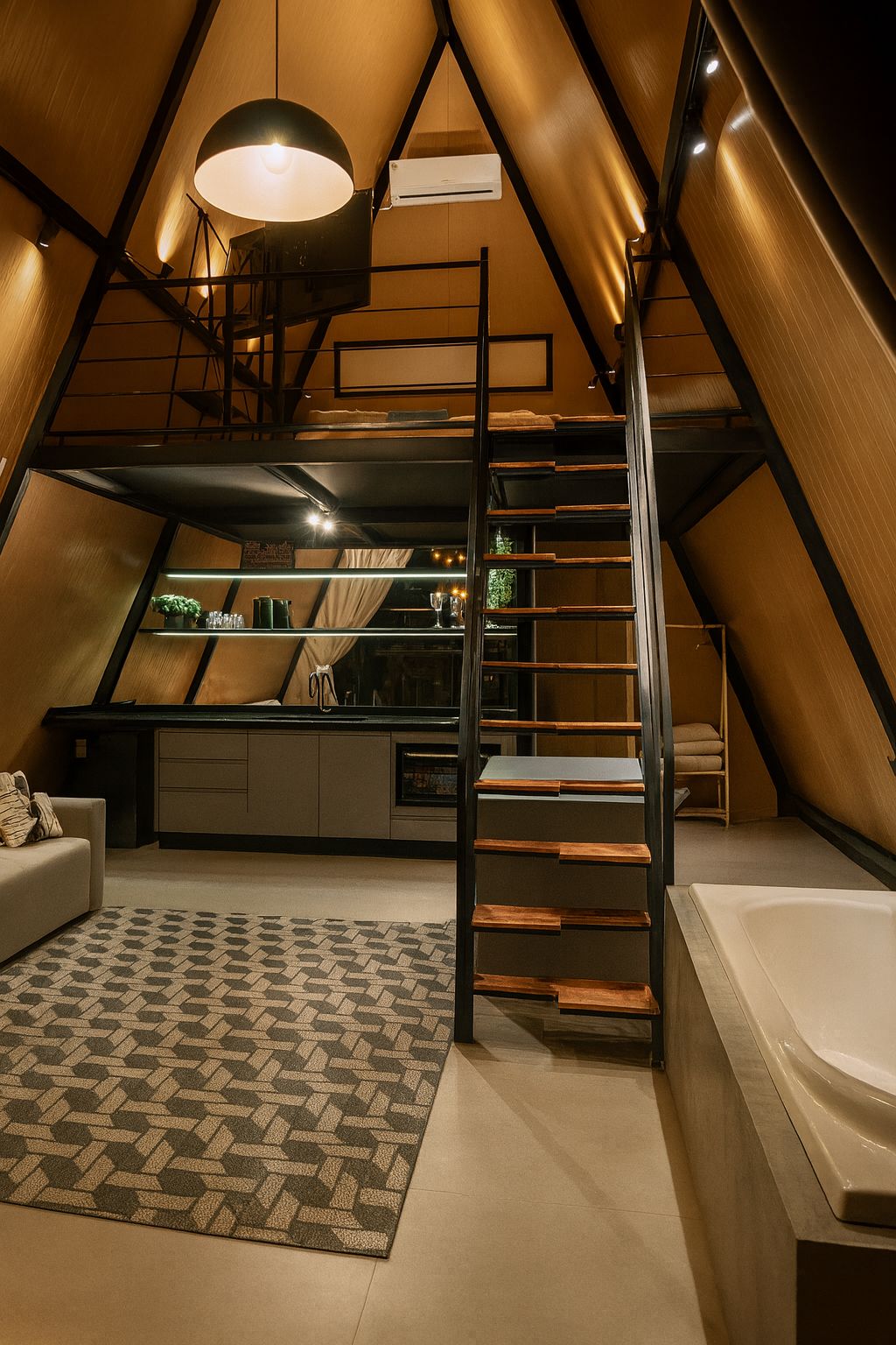 Aconchegante espaço e com design moderno, água quente central e banheira de hidromassagem. Conta com ar-condicionado quente e frio, sofá-cama de alta densidade, cama queen confortável, cozinha equipada, TV 4K e mezanino com vista incrível. Espaço amplo, elegante e ideal para dias de descanso com conforto e estilo. Chalé localizado em uma pousada na Praia de fora, a poucos metros do mar. Pousada possui áreas em comum e piscina aquecida.