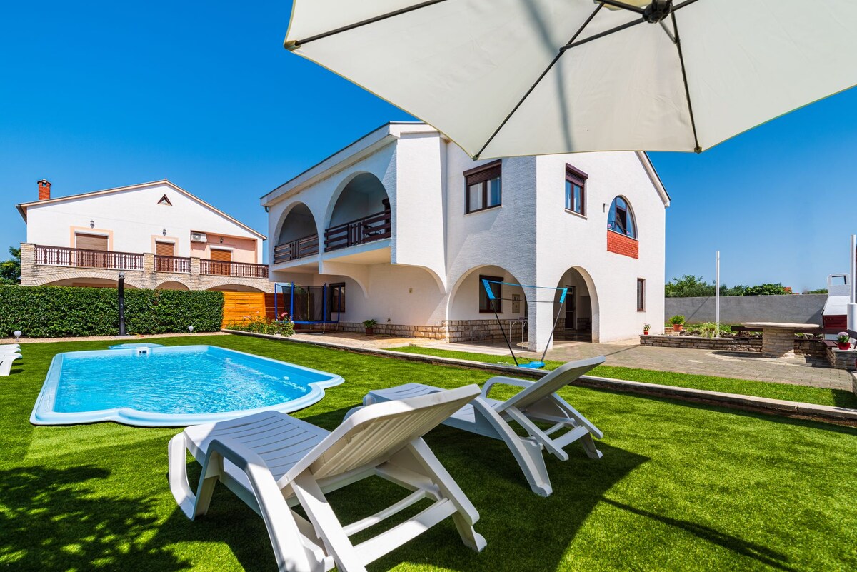 Ši graži vila su šildomu baseinu, sūkurine vonia ir sauna yra atokiame ir nuošaliame kraštovaizdyje, iš kurios atsiveria kvapą gniaužiantis vaizdas į slėnį Šildomas baseinas nuo balandžio iki lapkričio Puiki vieta atsipalaiduoti ir atspirties taškas tyrinėjant regioną ir Kroatiją! Atstumas iki miesto Zadaras yra už 28 km (oro uostas - už 20 km) Šibenikas yra už 50 km Splitas yra už 125 km (oro uostas - 99 km) Atrakcionavimo atstumas Plitvice ežerai už 125 km Krka už 45 km Kornati už 30 km
