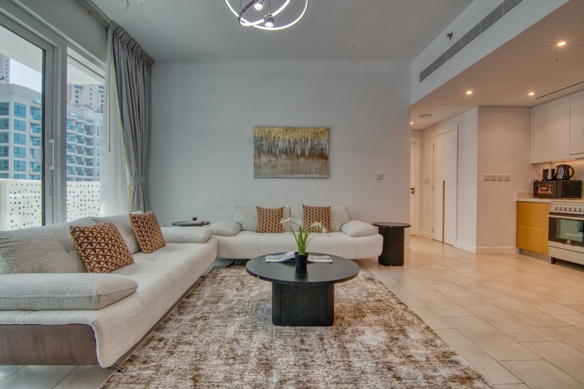🌅 Iš balkono atsiveria vaizdas į mariną, už kelių žingsnių yra 🚋 tramvajus, 🚇 metro ir trumpas pasivaikščiojimas iki 🏖 JBR paplūdimio! Šis elegantiškas 1 miegamojo būstas pasižymi moderniu stiliumi ir jaukia elegancija, aukštos klasės apdaila, šiuolaikiniais baldais 🛋 ir langais nuo grindų iki lubų ☀️. Netoli restoranų, parduotuvių ir pramogų 🍽️🌆. Atsipalaiduokite su šiuolaikiniais patogumais gyvybingame Dubajaus rajone 🌟. Užsisakykite išskirtinę kelionę į miestą! 🚤