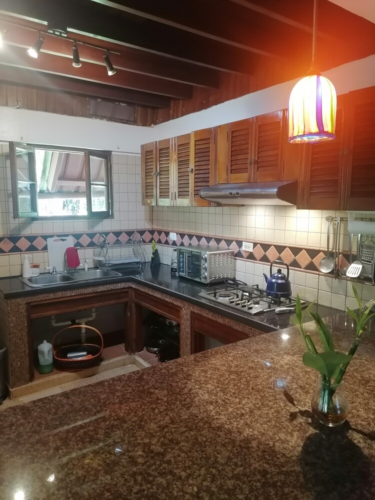 Chalet style home, fully furnished. 2 formal bedrooms with 3 beds on second floor. Outdoor BBQ area and Bohio. Kitchen and laundry facilities. Covered parking for 3 cars. Located in a gated mountain community, featuring 24 hr security, club house rest., pool, tennis/ basket ball courts and miles of beautiful hiking trails. A great place to unwind and enjoy nature, just 45 mins from the city.
