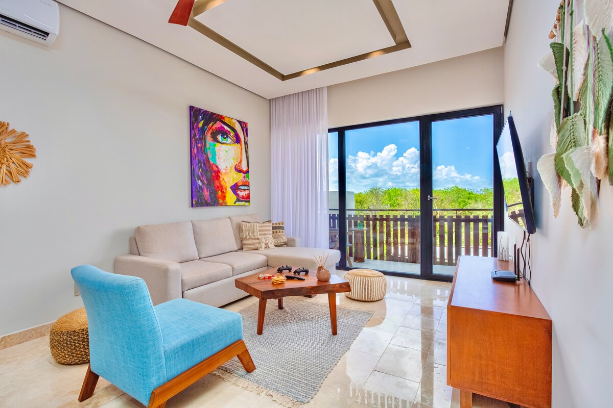 Prabangus butas 6 asmenims Prime Tulum vietovėje! Šiuose nuostabiuose 2 miegamųjų ir 2 vonių apartamentuose yra privatus balkonas su sūkurine vonia. Vos už 5 minučių kelio pėsčiomis nuo „Parque Jaguar“ rasite tiesioginį ir nemokamą paplūdimį. Aukštos klasės kondominiume yra aukščiausios kokybės patogumai, įskaitant pilnai įrengtą sporto salę ir ant stogo esantį begalybės baseiną su kvapą gniaužiančiomis džiunglėmis ir vaizdu į vandenyną. Idealiai tinka šeimoms, draugų grupėms arba keliautojams, ieškantiems ramybės ir artumo prie jūros.