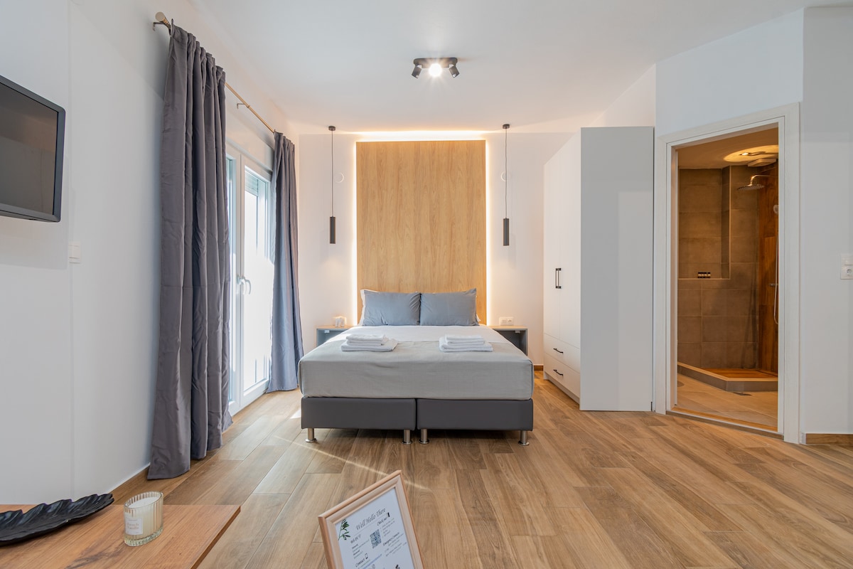 Visiškai nauja plėtra nuo 2025 m. liepos mėn. Patirkite rafinuotą prabangą šiame išmaniojo dizaino dviviečiame apartamente, puikiai tinkančiame iki keturių suaugusiųjų. Pirmame aukšte yra rafinuota svetainė su dvigule sofa-lova (1,6 x 2 m), pilnai įrengta virtuve ir stilingu vonios kambariu. Į viršutinį aukštą veda elegantiški laiptai, kuriuose laukia erdvus pagrindinis miegamasis, elegantiškas vonios kambarys ir privatus balkonas. Išeikite į 55m ² privačią lauko erdvę su nuostabiu privačiu baseinu