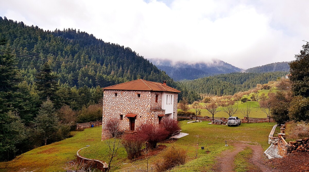 Our villa is spacious & well equipped with one master bedroom , three additional bedrooms, plus a beautiful garret & with two bathrooms. Stone is harmonically combined with wood & classical style while two fireplaces will add a warm feeling to your nights. Every single spot inside the house is a window for the most breathtaking view of the mountain. You will sleep by the burble sound of the rippling flow stream as it travels along the crossing river just outside the house. Pure magic ...