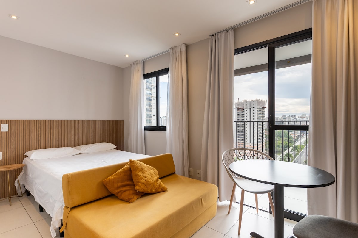 Studija su vaizdu į vieną gražiausių atvirukų San Paulo mieste, garsiajame Ponte Estaiada mieste. Jame gali apsistoti iki 4 žmonių, su dvigule lova ir dvigule sofa-lova, taip pat darbo erdve, pilnai įrengta virtuve, vonios kambariu su dujiniu dušu ir balkonu atsipalaiduoti. Įsikūręs Brooklin rajone, netoli Morumbi ir Market Place prekybos centrų, su lengva prieiga prie turgaviečių ir restoranų su puikia virtuve. Kondominiume yra laisvalaikio zona, sporto salė ir baseinas.