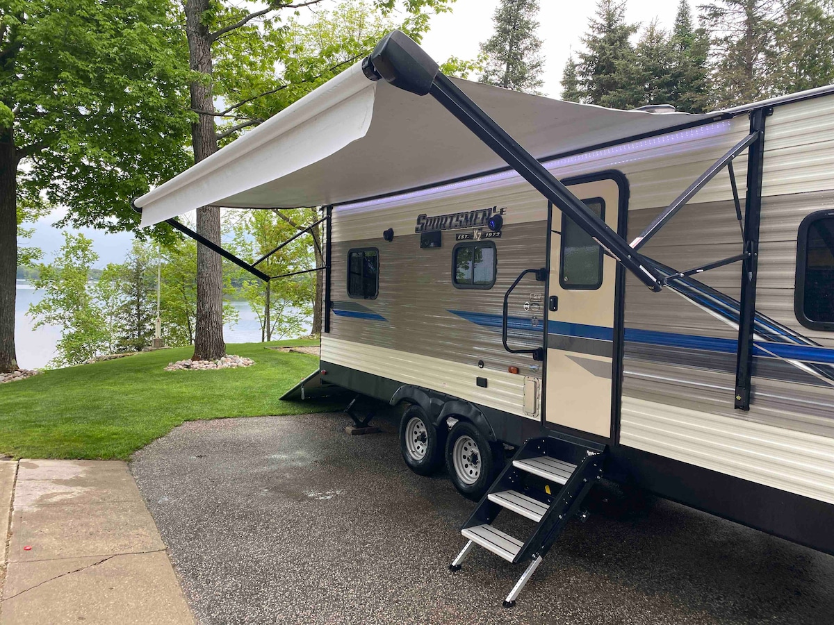 This older trailer sits in our campground with lots of outdoor space. Perfect for a couple who want to escape and enjoy nature, escape and unwind. Fully equipped with AC, barbecue, private firepit and all amenities of a cottage. Lakeside view. Docking and beach swimming just yards away. Experience trailer camping without the expense of buying! Fishing, walking, biking.