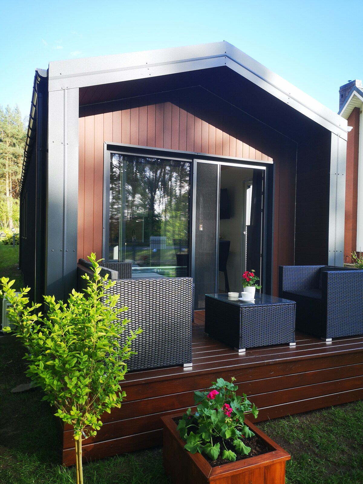 Gražus dizaino medinis namas Märkische Schweiz (už 50 km nuo Berlyno) yra mažame Ihlow menininkų kaime, iš kurio atsiveria gražus vaizdas į laukus ir miškus 65 kv. m gyvenamojoje erdvėje su dideliu langų priekiu ir 35 m2 dengta terasa. Yra didelė svetainė, valgomasis ir maisto ruošimo zona su medine virykle, taip pat du miegamieji ir vonios kambarys. Abiejuose miegamuosiuose yra infraraudonųjų spindulių šildytuvas. Kiekviename miegamajame yra dvigulė lova (1,60).