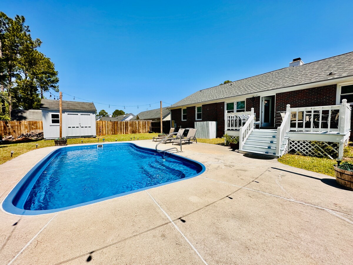 Pamirškite rūpesčius šioje erdvioje ir ramioje erdvėje. Riverbend yra netoli Vilmingtono NC, nuostabiame Burgaw mieste. Įsikūręs ant NE Fear upės kyšulio krantų, tai puiki vieta poilsiui. Vos už mylios nuo Old River Farms vestuvių vietos, 20 minučių nuo Vilmingtono centro ir šiek tiek daugiau iki Wrightsville paplūdimio. Namuose gali apsistoti 10 suaugusiųjų arba iki 12 žmonių su vaikais. Mėgaukitės prieplauka, nušaukite baseiną ir žaiskite futbolo kamuolį. Šiame būste yra viskas.