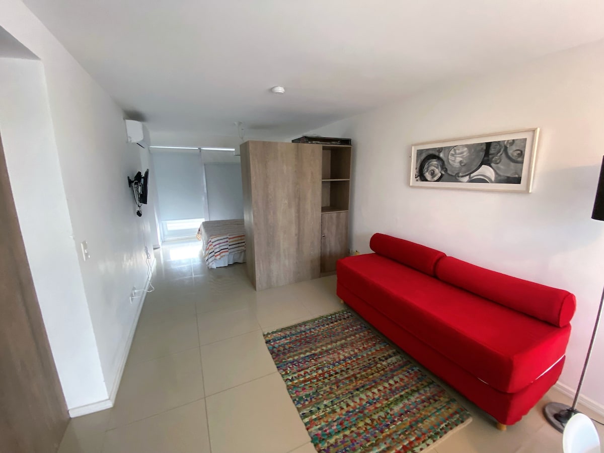 Este lugar tiene una ubicación estratégica: cerca de todo caminando. Tiendas , restaurantes, súper , etc. La mejor vista a los atardeceres del Puerto. Séptimo piso. Balcón amplio con mesa y 4 sillas y living exterior. A pesar de ser monoambiente es amplio y tiene todo!! Ropero grande . Mesada en cocina con banquetas. Cocina completa . Horno , añafe , microondas y heladera con freezer. Baño completo con roperos y lava seca ropa. Portero 24 horas. Cualquier necesidad extra , consultar.