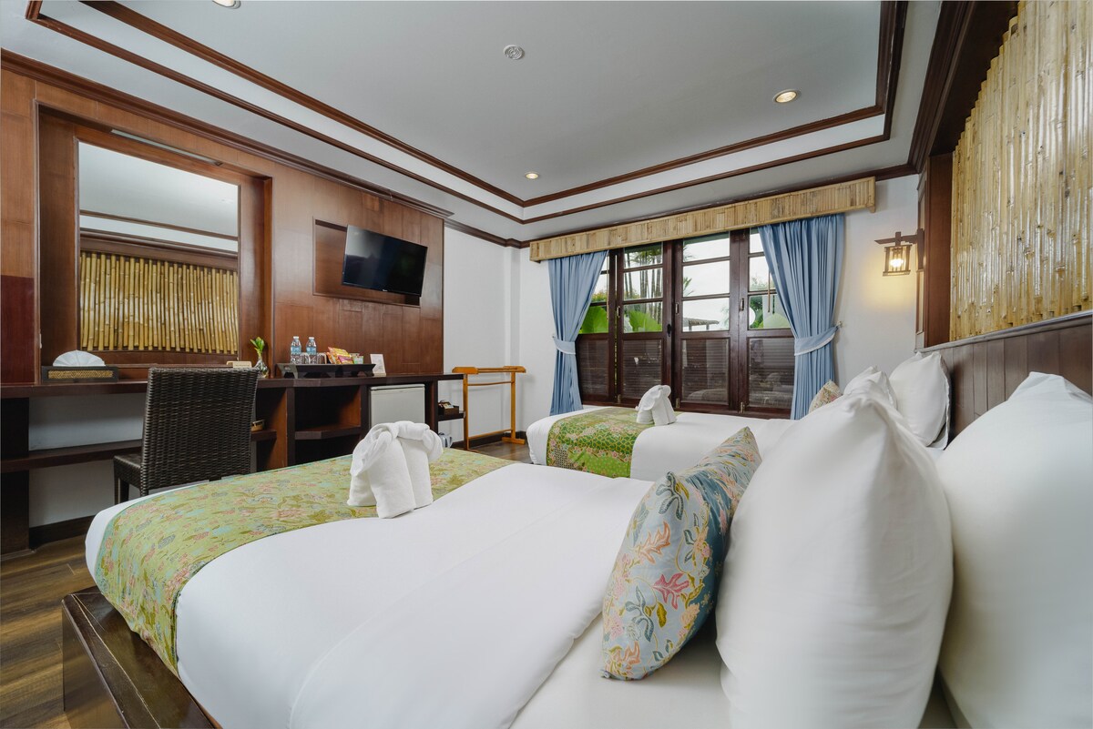 Vacation Village Phra Nang Inn. Kurorto stiliaus vintažas Įsikūręs Ao nang paplūdimyje Krabi. ir kurorte netoli prieplaukos iki Railay paplūdimio.(Prieplauka yra priešais kurortą) Kurorto vieta - už 40 metrų nuo Aonango paplūdimio. //Įranga// SPA/ masažas. Jogos kambarys.( stogo terasa ) Restoranai/ baras. Plaukimo baseinas. Pusryčiai ( pirkti bilietus registratūroje ) 1 jaunesnis nei 12 metų vaikas apsistoja NEMOKAMAI. Kambario dydis: 32 m²
