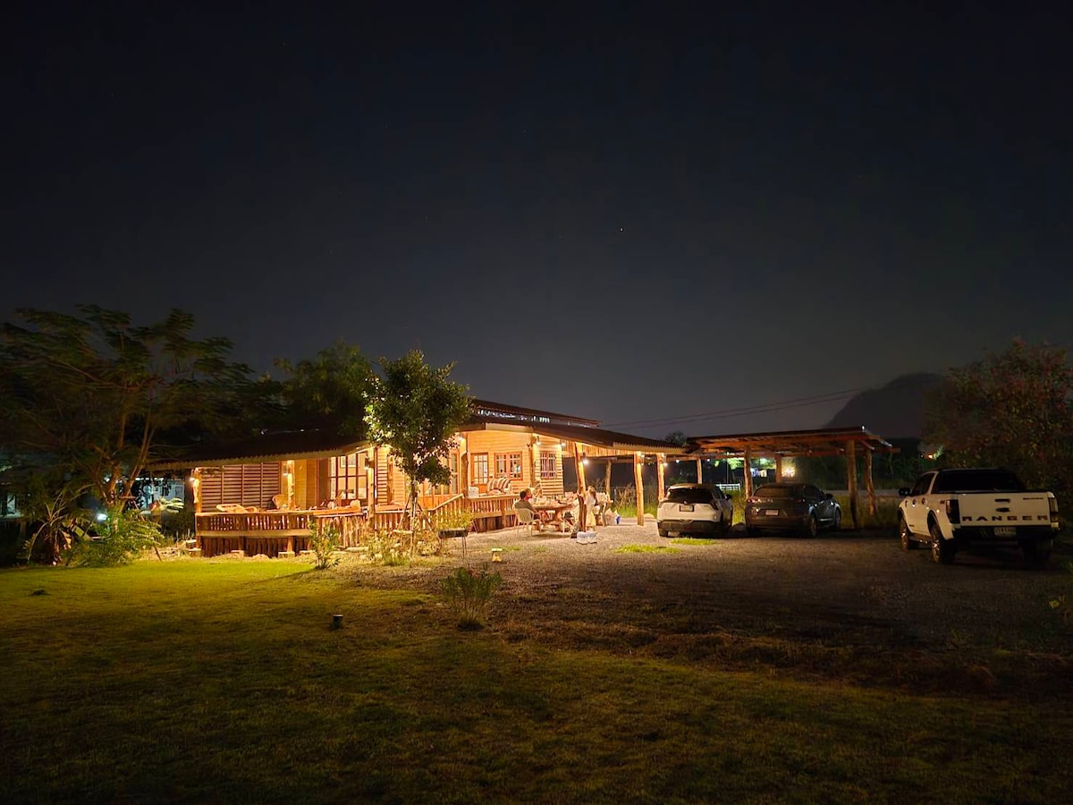 Mūsų ramūs namai puikiai tinka šeimoms atsipalaiduoti. Pilnai įrengti virtuvės reikmenys, šaldytuvas, mikrobangų krosnelė, maža viryklė, mažas shabu puodas ir indai bei stalo įrankiai. Skalbimo mašina, didelio ekrano televizorius, 60 colių Samsung išmanusis televizorius, kepsninė, lauko terasa prie vandens. Svečių teisės - Neribota nemokama prieiga prie baziliko gėlių sodo ir kavos nemokamai visos viešnagės metu. Lankytinos vietos netoliese - Bazilikas ir kava: kava, bazilikas ir gėlių sodas - Khao Jean Lae šventykla: nuopelnų gaminimas, povų stebėjimas, važiavimas dviračiu, laipiojimas. - Kinijos Khao Lae saulėgrąžų laukas (nuo gruodžio iki sausio mėn.)