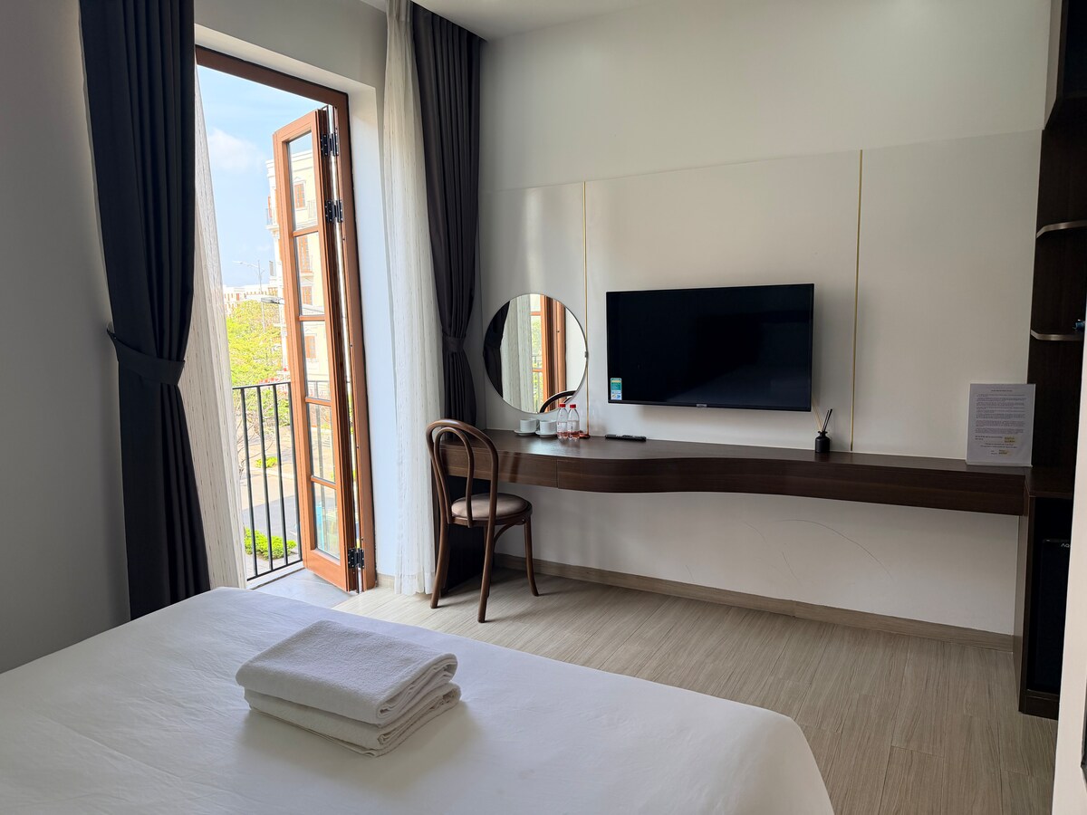 Mellon Oasis, įsikūręs Saulėlydžio miesto (An Thoi) viduryje. Adresas: Positano 91, Khu Sunset Town (Đəa Trung Həi), An Thəi Mūsų erdviame kambaryje (40 kv. m) svečiams yra karališka lova (1,8×2 m), 65 colių išmanusis televizorius, oro kondicionierius, darbo stalas, mini šaldytuvas, sofa, spinta, plaukų džiovintuvas, virdulys ir garinė lygintuvas. Privačiame vonios kambaryje yra vonia, kurioje gali apsistoti 2 žmonės, ir dušas su lietaus dušu.
