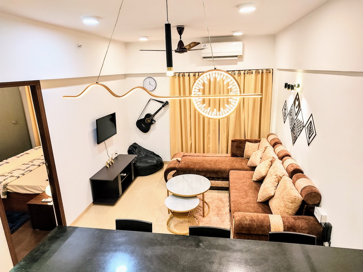 Wi-Fi įjungtas - gerai įrengtas, erdvus 600 kv. pėdų 1 BHK butas 20-ame aukšte aplink golfo aikštyną. Šis butas nukreiptas į Grand MCA stadioną ir Western Ghats - vaizdas iš kiekvieno kambario. Gerai įrengtame bute yra visi patogumai, įskaitant gerai įrengtą virtuvę su pagrindiniais poreikiais, pvz., arbata/kava, prieskoniais. 9 duobučių, par 27 golfo aikštynas būste svečiams yra prieinamas mokamu ir žaidimų pagrindu. Ne golfo žaidėjai gali mėgautis pasivaikščiojimu po trasą ir promenadą prie upės.