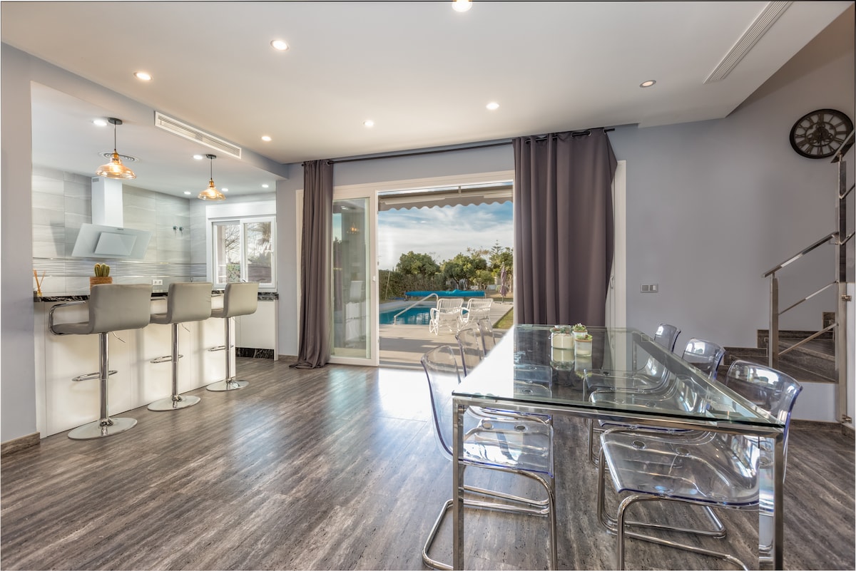 Modernus poilsio namelis su baseinu (9,5 m x 5 m) daugiau nei 1000 m2 sklype, Pinos de Alhaurín. Name yra virtuvėlė, integruota į didelę svetainės valgomąjį su židiniu, visa tai yra atviroje ir šviesioje erdvėje, iš kurios galima tiesiogiai patekti į terasą ir sodą. Namas yra pilnai įrengtas, su a/c ir skirtas svajonių atostogoms (paklodės, rankšluosčiai, orkaitė, Nespresso aparatas, indaplovė, centrinis oro kondicionierius, kepsninės zona, alaus čiaupas pagal pageidavimą...)