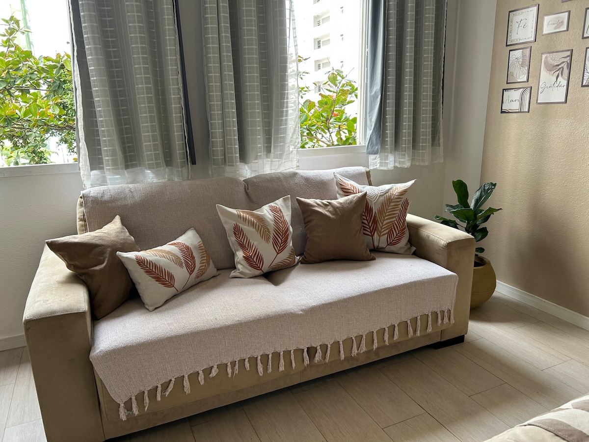 80m² butas 22 aukšte su panoramine terasa ir fantastišku vaizdu į Pitangueiras paplūdimį ir, toliau, Astūriją. Privilegijuota vieta (Morro do Maluf), kurioje dera ramybė su šio paplūdimio paslaugų ir prekybos patogumais. Jis yra vos už 800 m nuo prekybos centro „La Plage“ ir už 300 m nuo Enseados pradžios. 1 dengta automobilių stovėjimo vieta, paplūdimio paslaugos (skėtis ir kėdės) ir visą parą veikiantis konsjeržas. Wi-Fi. Jūs negaunate augintinių. Miegamajame yra ventiliatorius ir oro kondicionierius. Oxxo nuo 24 val. iki 750 m.