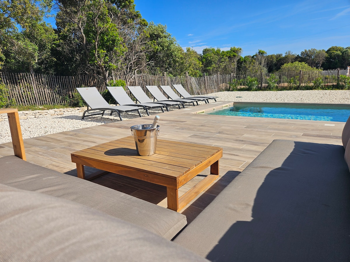 Ši romantiška akmeninė vila yra prestižiniame Clos Canarelli vyno dvare, pusiaukelėje tarp Porto Vecchio ir Bonifacio, salos pietuose. Namas yra erdvus, tylus ir šiltas, apsuptas medžių, uolų. Privatus baseinas šildomas nuo gegužės iki rugsėjo ir po sezono, jei klimatas jam tinka. Namuose gali apsistoti vaikas (įranga teikiama pagal pageidavimą:lova, aukšta kėdutė...) Pusryčiai gali būti tiekiami pagal poreikį