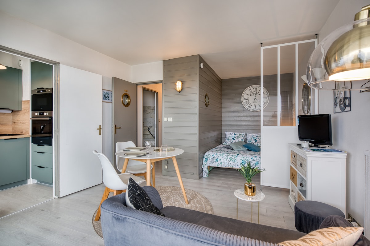 Saugaus 1972 m. pastato centre, priešais Corniche de Concarneau, už 5 min. kelio pėsčiomis nuo miesto sienų, yra 27 m² studija su 160 cm lova. Paplūdimiai pėsčiomis. Wi-Fi. 12 m² terasa, įrengta sezono metu. Privati požeminė stovėjimo aikštelė 1 mažam arba vidutinio dydžio automobiliui apsistojant 4 naktims ar ilgiau. Aukščio riba 1,90 m! Įėjimas laiptais. Sveiki atvykę nuo 16.00 iki 20.00 val. Išvykimas iki 11 val. ⚠️Negalime apgyvendinti svečių su dviračiais. Perskaitykite namų taisykles.
