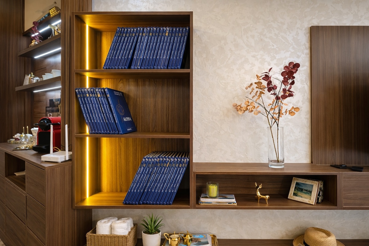 Welcome to our modern, cozy apartment where comfort meets style. Enjoy a bright living room with navy sofas, a sleek kitchen, and a dining area for six. The space includes fast WiFi, a flat-screen TV (Bein sports, IPTV service), and elegant décor. Large windows fill it with natural light and calm energy. Just 3 mins to the train station, 2 mins to Carrefour and 5min driving to the beach & City Center… ( not allowed for unmarried couples) Perfect for relaxing short or long stays.