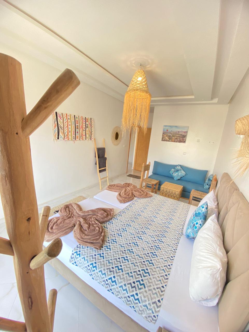 Paplūdimio apartamentai su nuostabiu vaizdu į paplūdimį ir Taghazout kaimelį, su atskiru balkonu, vonios kambariu, virtuve ir tualetu. Lofte gali apsistoti iki 4 asmenų, o erdvė yra 2 aukšte.