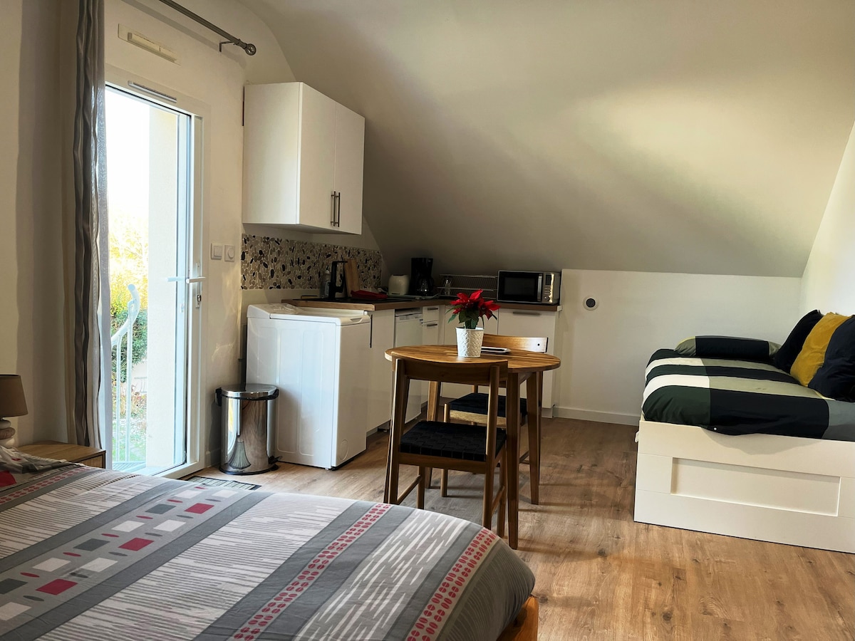 Tai graži ir funkcionali studija su vonios kambariu ir virtuve, priklijuota prie mūsų namų, bet visiškai nepriklausoma. Miegamasis yra ant mezonino, o poilsio zona yra jauki vieta pavalgyti ir atsipalaiduoti. Rinkinys yra šviesus ir gerai vėdinamas su dviem velux. Aplinka yra maloni, žalia ir atpalaiduojanti. Jis yra netoli visų patogumų su gyvybingu Ploemeur kaimu, esančiu už 800 m, ir natūralių erdvių papėdėje: miške, tvenkiniuose ir pajūryje.