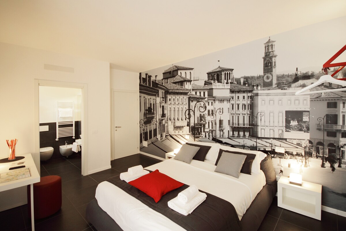 Stipriomis spalvomis ir švariomis linijomis stengėmės suderinti mūsų miesto praeitį ir dabartį su stiliumi ir kūrybiškumu, ypatingą dėmesį skirdami komfortui ir Made in Italy dizainui. Bute yra dvigulė lova, su galimybe įrengti trečią lovą, oro kondicionierių, saugų, nemokamą belaidį ryšį, leidžiantį laisvai naršyti, ir mezaniną su įrengta virtuve, kurioje galima gaminti tai, kas jums patinka.