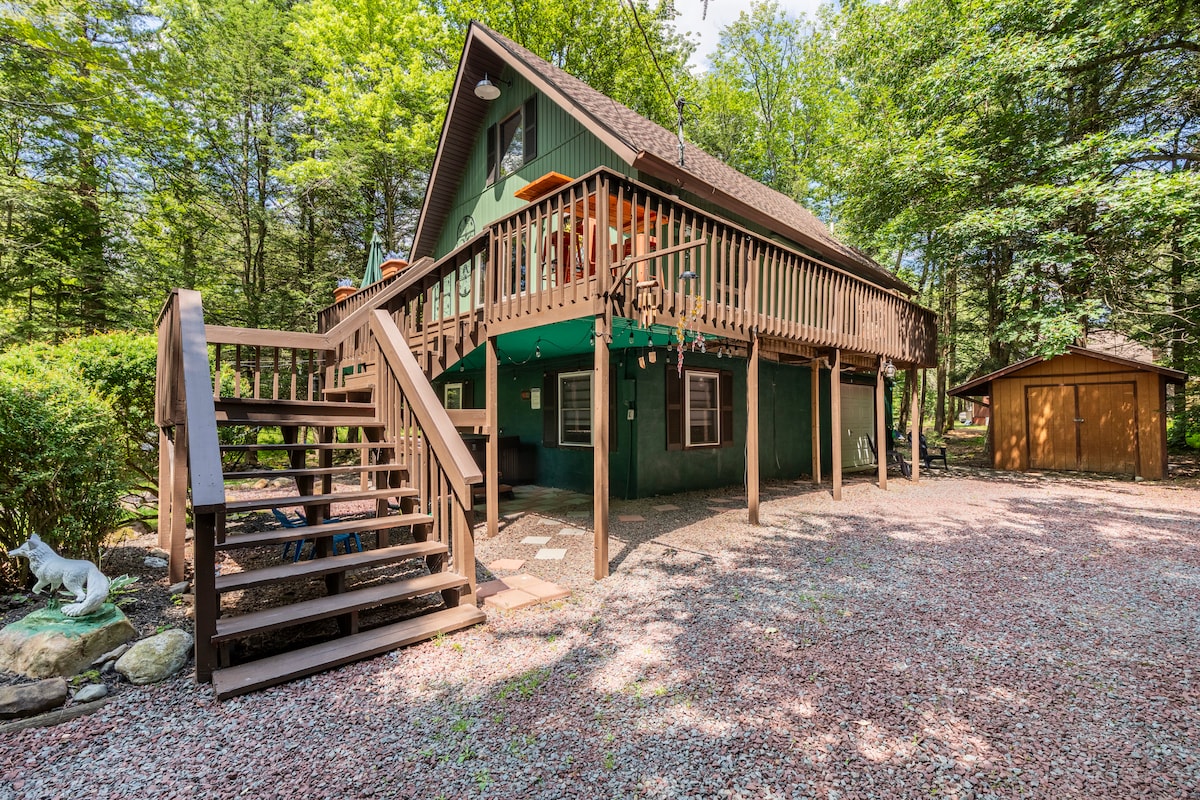 Welcome to The Lucky Fox. One-of-a-kind ; 3 bed 2 bath with privacy and stream side scenic views right outside your window Make unbeatable memories in our unique chalet with lots of character and all the comforts of home, it is nestled in its own cul-de-sac which provides a sense of privacy and seclusion while being surrounded by all the beautiful wildlife and nature that the Poconos has to offer