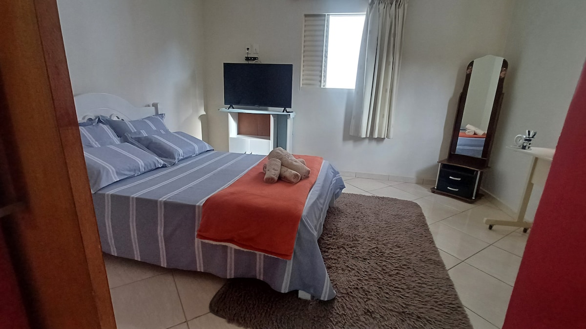 Esse delicioso apartamento situa-se a 700 m do centro da cidade. Possui uma cama de casal e um sofá cama, sendo possível a acomodação de até 4 pessoas. Utensílios de cozinha completo, climatizador, 2 televisões, uma no quarto e outra na sala, roupas de cama e banho, vaga para 1 carro de pequeno ou médio porte no estacionamento do prédio. Será um prazer receber todos os hóspedes.