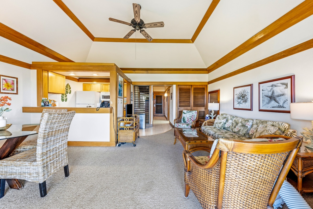 This beautiful 1-bdrm Kiahuna Plantation top floor condo has AC, vaulted ceilings, partial ocean views, and a central property location. Poipu beach is a short 3-min walk away, making this an ideal haven to relax between outings to the beach, hikes, and all the amazing sights and opportunities Kauai has to offer. Includes all-access to the Poipu Athletic Club across the street with a gym, outdoor pool, hot tub, tennis courts, basketball courts, and a bar and grill. Enjoy your stay in paradise!