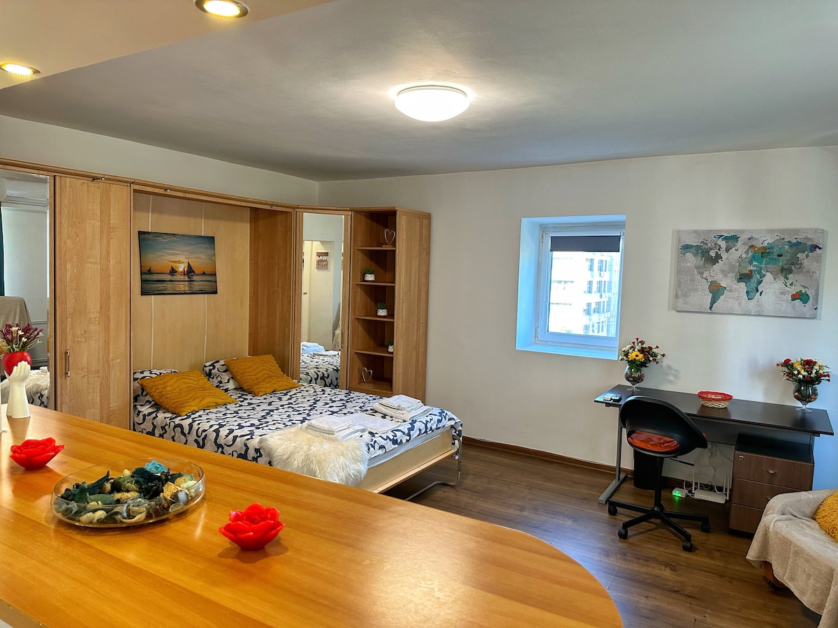 Sveiki atvykę į miesto centro apartamentus! Atraskite modernią, svetingą ir puikiai įrengtą erdvę gyvybingoje Bukarešto širdyje. Ši stilinga studija suteikia idealią pusiausvyrą tarp namų komforto ir puikios vietos prieinamumo. Vos už 500 metrų nuo metro stoties „Constantin Brancoveanu“ ir vos už 10 minučių kelio automobiliu nuo Unirii aikštės, miestas bus jūsų kojose — nesvarbu, ar esate čia darbo, poilsio ar tyrinėjimo tikslais.