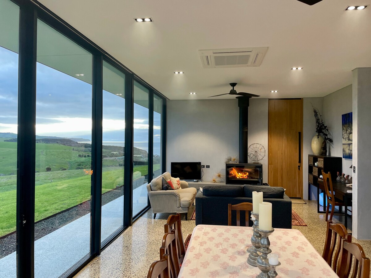 Peržiūrėkite mūsų naujosios sesers nuosavybę: https://www.airbnb.com.au/rooms/951596004600270574? Ant kalvos esantis Keiptaunas gali pasigirti nuostabiais panoraminiais Emu įlankos vaizdais. Šiuose stilinguose namuose yra 4 miegamieji su prabangia patalyne, 2 vonios kambariai ir nuostabi svetainė, tekanti į didelę terasą. Įspūdingi Capes vaizdai į įlanką ir už jos ribų yra prieglobstis tiems, kurie ieško ramybės ir ramybės su vandenyno oro purslais. Minimalus poveikis aplinkai: saulės kolektoriai ir lietaus vandens surinkimas.