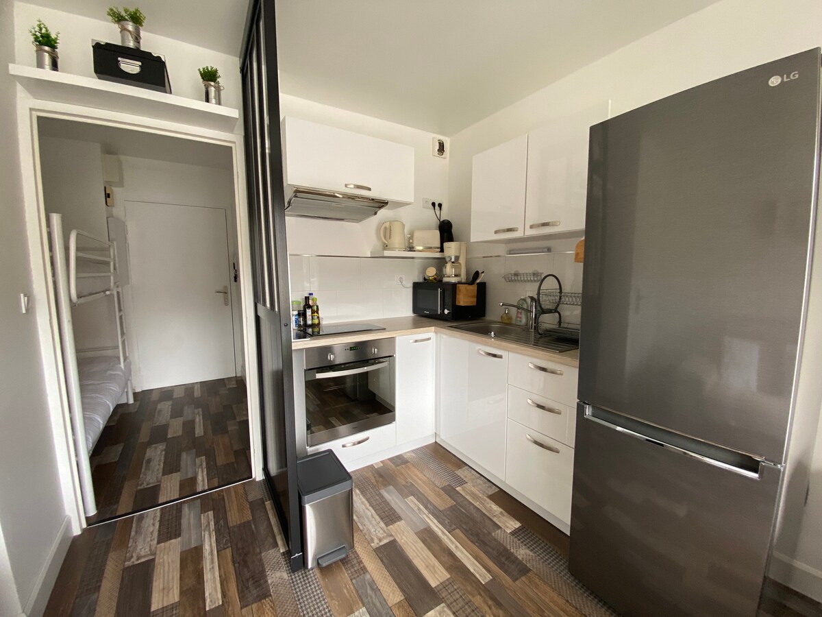 Pornichet širdyje, viskas pėsčiomis. Paplūdimys, parduotuvės, turgus, restoranai, traukinių stotis. Gyvenamoji vieta priešais gražų knygų pardavėjų paplūdimį... Puiki trobelės studija, kokybė. Privati automobilių stovėjimo vieta. Gyvenamojoje vietoje, priešais prabangią jūrą, puiki studija su vaizdu į galą. Labai aiškus ir lengvai pasiekiamas. Ateikite ir atraskite, būsite sužavėti... Apstatyta virtuvės svetainė, kokybiška sofa-lova, plokščias ekranas, pluoštas, terasa. Miegojimo zona su dviaukšte lova, spintomis. Vonios kambaryje yra tualetas