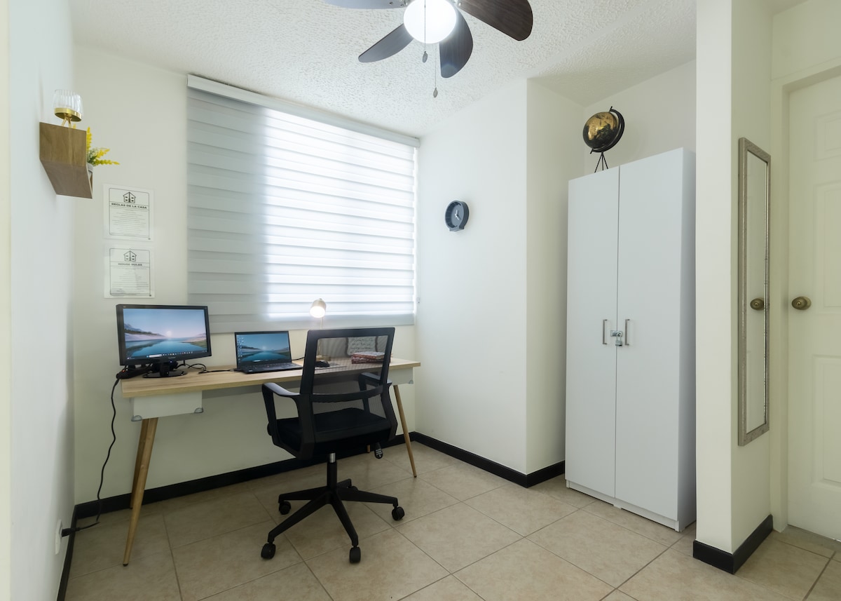 Kondominiume yra 2 miegamieji, svetainė, valgomasis, virtuvė, 2 vonios kambariai ir jis yra už 2 mylių nuo SJO oro uosto. Be to, būsite vos už 2 minučių kelio nuo prekybos centro „City Mall“ ir „Walmart“. • Galimas pervežimas iš ir į oro uostą (už papildomą mokestį) • Apsauga visą parą • Baseiną • Sporto salę • Bendradarbiavimo erdvę • Didelės spartos internetą • Klubą • Vieta pastatyti automobilį Bute rasite kavą, pilnai įrengtą virtuvę, oro kondicionierių (miegamuosiuose ir svetainėje), televizorių, karališko dydžio lovą ir pilno dydžio lovą.