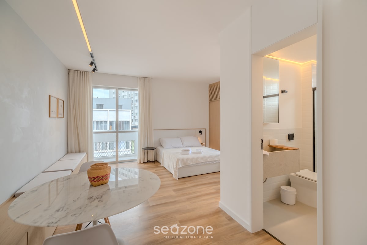 Jūsų poilsis pačioje Florianopolio širdyje! 1 miegamojo studija, visiškai renovuota ir suprojektuota jūsų patogumui. Su oro kondicionieriumi, įrengta virtuve ir jaukia dekoracija. Kiekviena detalė kviečia atsipalaiduoti ir jaustis kaip namie. Vieta puiki: vos keli žingsniai nuo žavingos Praça XV ir Centro de Eventos Centrosul. Lengvai pasiekiami turgūs, barai, restoranai ir viskas, ką gali pasiūlyti centras. *Pastate nėra garažo, bet yra automobilių stovėjimo vietų gatvėje ir netoliese yra automobilių stovėjimo aikštelė *