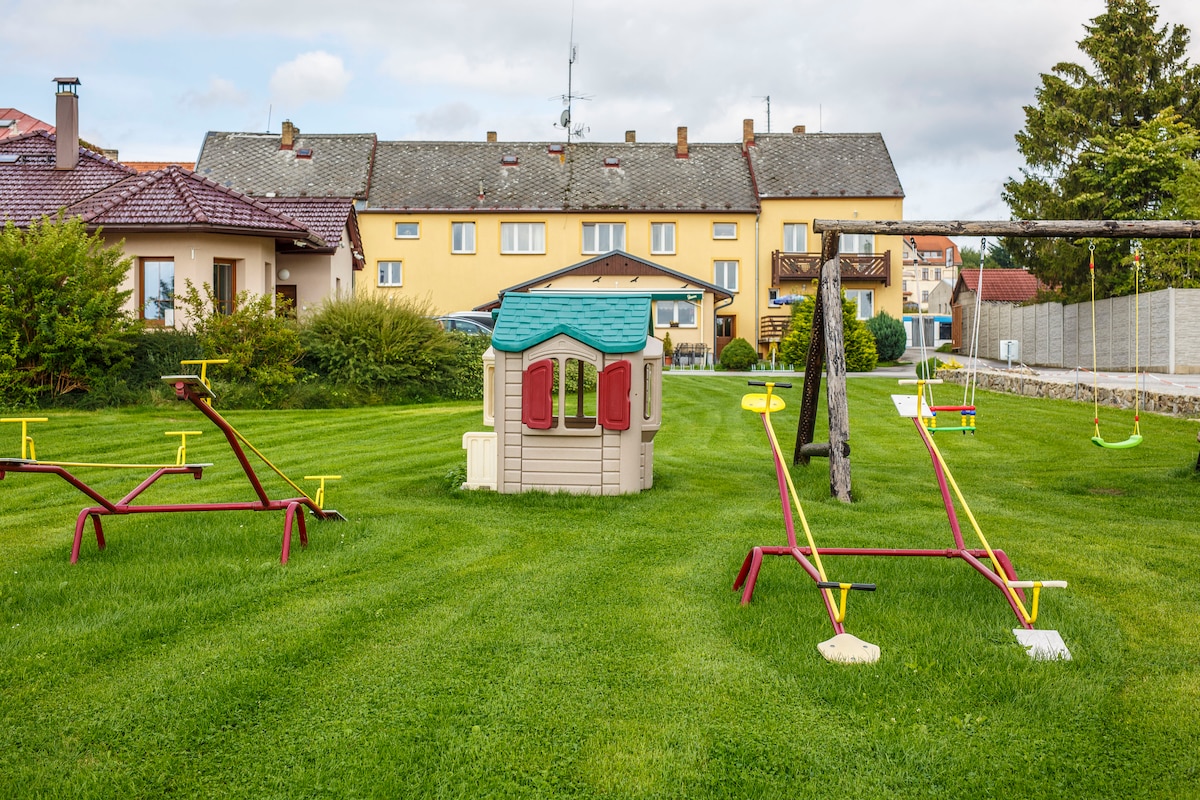 Idealus kotedžas šeimos poilsiui Bohemijos miške, veikiantis ištisus metus. Du miegamieji (2+2 ir 2 lovos),dvi svetainės (2 lovos viršuje), dvi įrengtos virtuvės,du vonios kambariai, trys tualetai. Pirmame aukšte yra infraraudonųjų spindulių pirtis ir sūkurinė vonia (už papildomą mokestį),privati suomiška pirtis už 1 km (už papildomą mokestį). Visiškai tylu. Nuosavas tvenkinys. Lauko žaidimų aikštelė (sūpynės, čiuožykla, smėlio dėžė). Naujai pastatyta dengta vasaros virtuvė lauko sėdimoms vietoms (pavėsinė) su židiniu, geriamuoju vandeniu,elektrine virykle ir elektra.