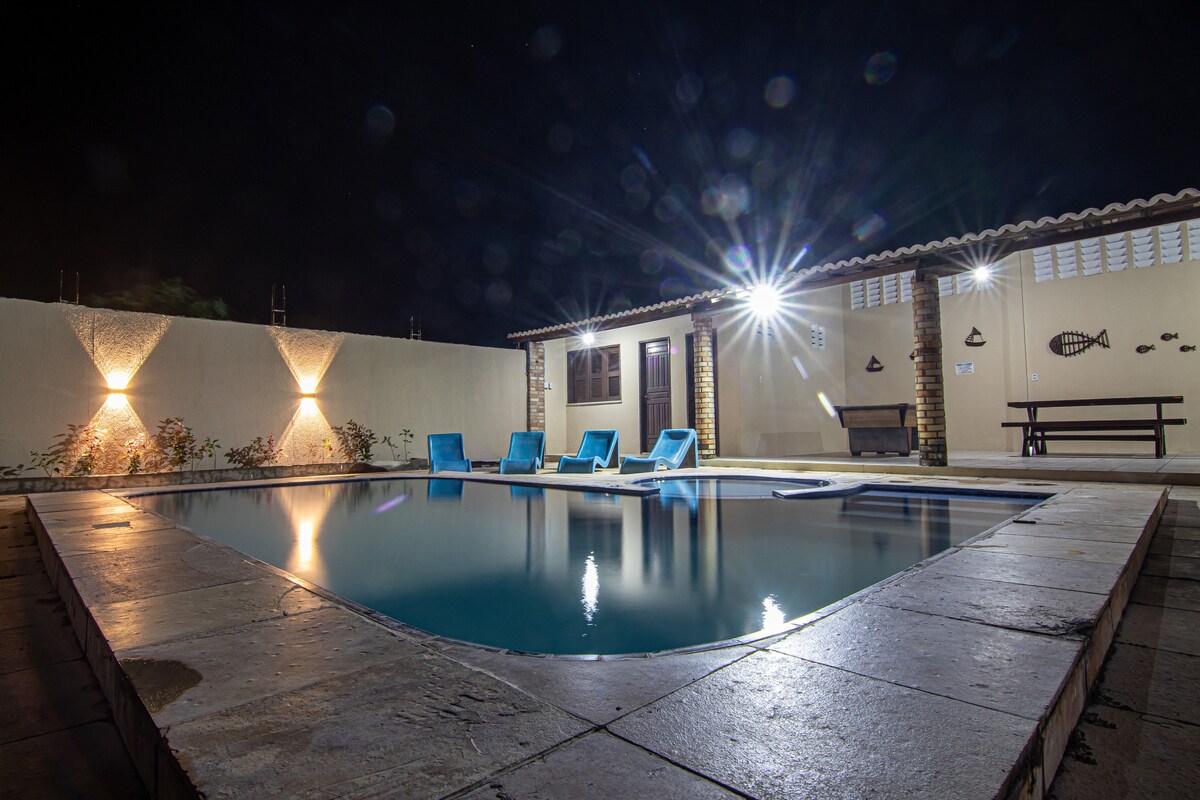 Puiki vieta pailsėti ir atsipalaiduoti. Jaukus namas, dvipusis, su 200 m² pastatyta, 900 metrų bendro ploto, plačia lauko erdve, baseinu, terasa su kepsnine, sodais, veja ir balkonais. Jis yra mažiau nei už kvartalo nuo paplūdimio, centrinėje vietoje, netoli Donana viešbučių, Jangadeiro, Pousada do Sol ir „Mangue Seco“ turgaus. Jame yra 4 miegamieji ir 3 apartamentai. Pastaba: jame yra Wi-Fi! *Už 50 min. kelio nuo Pinto Martins oro uosto ir 60 min. iki Aldeota.