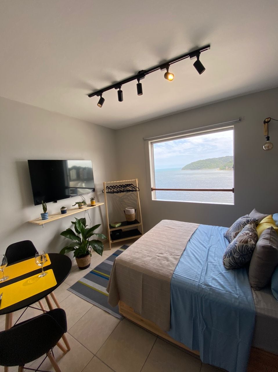 Apartamento tipo sala living, bem iluminado e arejado, com varanda espaçosa e vista para o mar em frente à Praia do Gonzaguinha em São Vicente. Portaria 24h e 1 vaga de estacionamento. Oferta Especial: Seg à Quinta R$ 507,00; Seg à Sexta R$ 627,00; Seg à Dom R$ 1007,00. Check-out estendido no domingo mediante taxa. Exceto Feriados Nas acomodações dispomos de ar condicionado split, quarto com cama de casal separado por porta de correr e um closet. Fornecemos roupa de cama e toalha de rosto.
