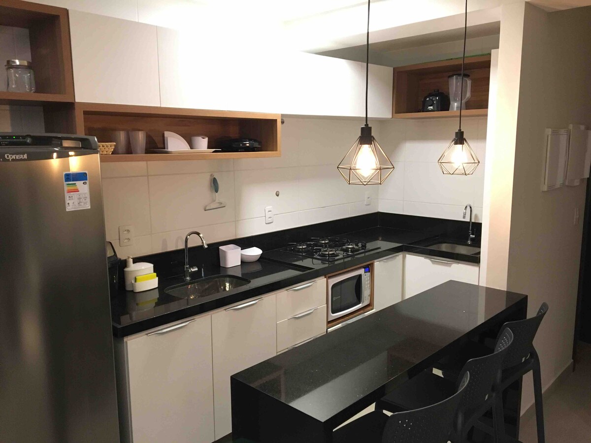 Butas kurorto kondominiume, stovinčiame Paraíso do Atlântico rajone, su baseinais šeimai, sauna, sūkurine vonia, sporto sale ir kt., esančiame paradisiacal Ponta de Campina, João Pessoa. Paplūdimys yra rami ir švari mėlynai žalia jūra, puikiai tinka dienai ir už kelių minučių kelio automobiliu nuo daugybės sostinės lankytinų vietų ir patogumų. Apê yra 2 dviviečiai miegamieji su oro kondicionieriumi ir 1 „Queen Suite“, didelis ir vėdinamas balkonas su vaizdu į jūrą, visa amerikietiška virtuve ir su meile dekoruotas ❤