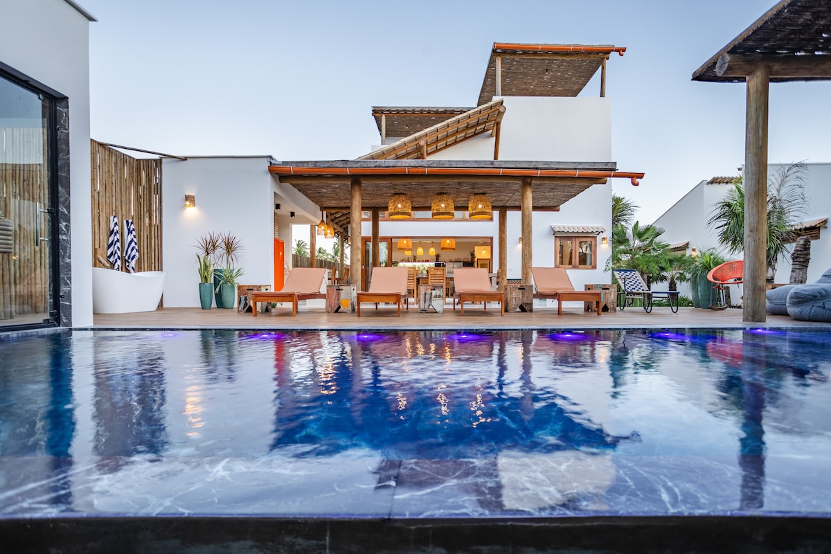 Villa Luz do Mar is an exclusive luxurious villa located in the heart of Jeri. It accommodates up to 11 guests in 5 elegant suites. Relax in the private pool and enjoy Jeri's famous sunset from the rooftop terrace in an original Jacuzzi (surcharge) and stunning sea views. Perfect for families, groups, and kitesurfers, with the best spots nearby. Enjoy a delicious breakfast (surcharge), garden barbecue, and a fully equipped kitchen. With fiber-optic internet, it’s also perfect for remote work.
