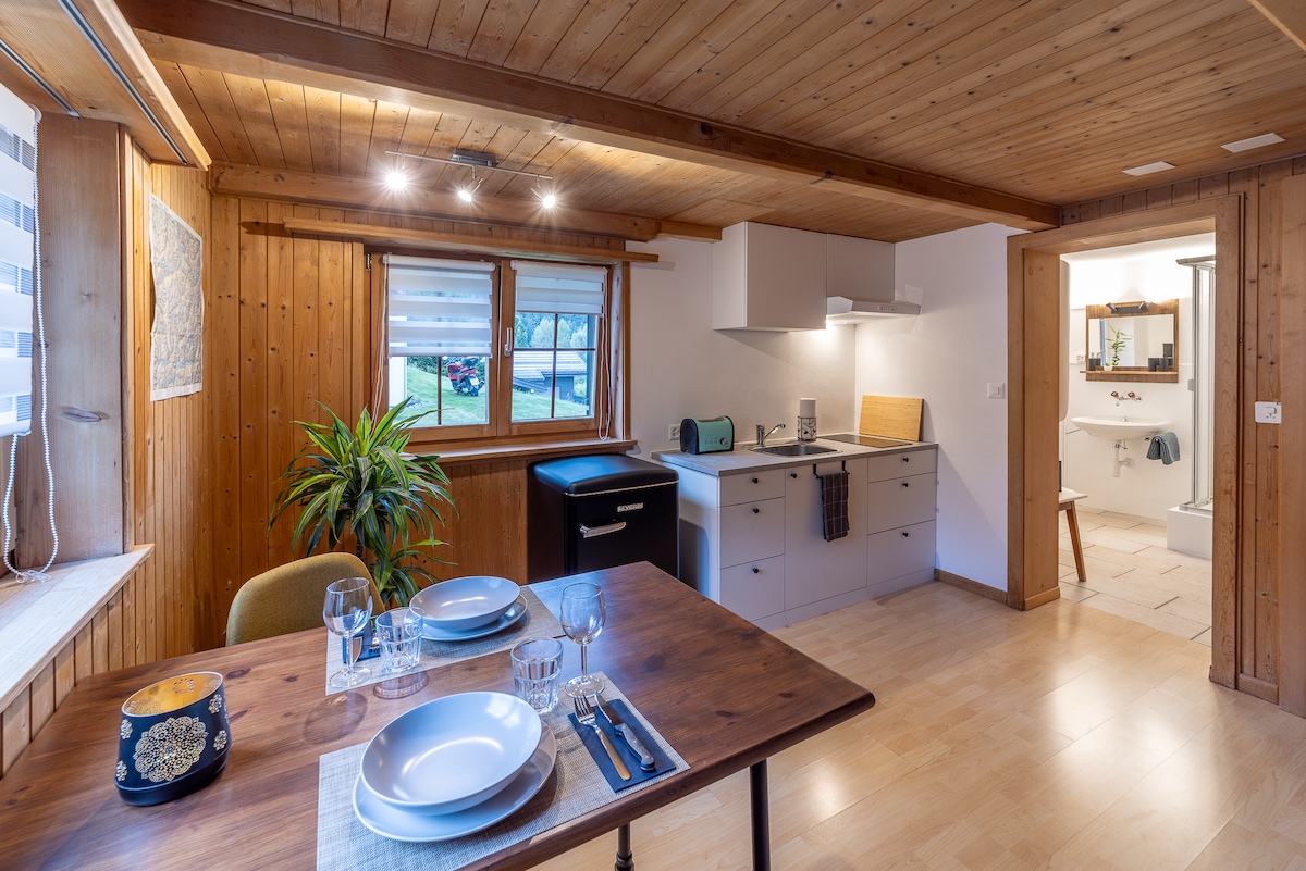 Butas su meile konvertuoti stabilus centrinėje vietoje. Yra automobilių stovėjimo aikštelė. Traukinių stotis, autobusas ir Madrisabahn (slidinėjimo/žygių regionas) prie jūsų durų. Gotschna/Parsenn plotas pasiekiamas viešuoju transportu per kelias minutes. 58 m2 didelis, granulių viryklė, erdvus gyvenamasis plotas su atvira virtuve, įskaitant. Miegamoji zona (dvigulė lova) galerijoje su stoglangiu. Dvigulė lova, 2 atsarginės lovos. Vonios kambarys/WC su vonios vamzdeliu. Wi-Fi. Padengta saulėta veranda su vaizdu į kalnus.