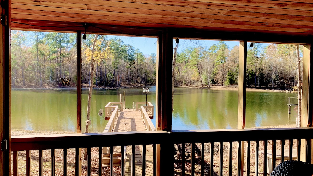 4 Bedroom 7 beds and 2 bathroom Lake Retreat on Lake Murray. Huge front porch and backyard screened in porch overlooking Lake Murray, with grills, overlooking lake to watch the Sunset. Steps away is huge dock with 10 feet of water at end of dock, with ladder for swimming or parking boats, private boat landing for launching boat, that is concrete out past dock , and have 3 kayaks on property, and may floats for floating at private dock.